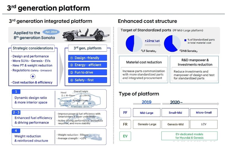 3세대 플랫폼으로는 내연기관 뿐만 아니라 대용량 배터리팩 또한 적용이 가능한 배터리 전기차 등으로 미래지향적이게끔 수용할 수 있는 차세대 플랫폼으로 보인답니다.