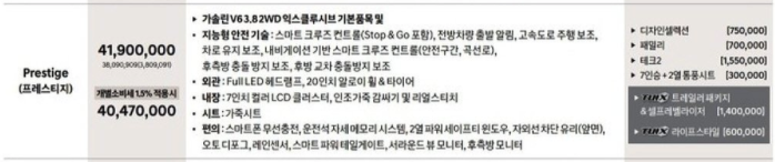 프레시티지 트림은 4,047만 원으로 캐소세 5% 기준은 4,190만 원으로 책정이 되었으며, 이는 기존 차량 대비 약 85만 원정도 인상된 것으로 볼 수 있습니다.