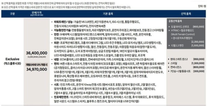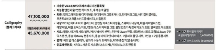 새롭게 추가가 되어진 최상위 모델로 캘리그래피 VIP 패키지의 가격 또한 알려졌는데, 이는 5,137만 원으로 책정이 되었습니다. 트림별로 가격 또한 다른데, 익스클루시브는 개소세 5% 기준 3,640만 원이며, 3,497만 원으로 책정되었습니다. 기존 모델 대비 약 100만 원정도 인상이 되어보입니다.