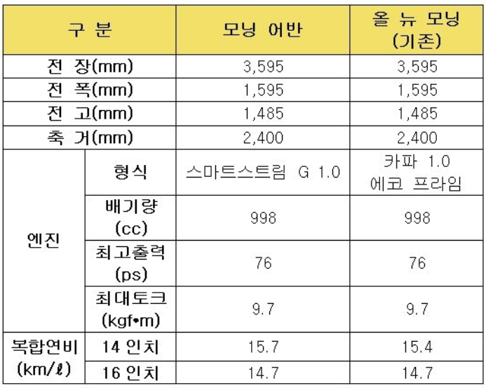 모닝 어반 파워트레인이 개선되어 스마트스트림 G1.0 엔진 그리고 4단 자동변속기가 조합되었고 최고출력은 76마력에 최대토크가 9.7kgm 정도에 성능을 보여준다고 합니다. 출력 그리고 토크는 기존 차량과는 동일하지만 복합연비가 14인치 타이어 기준으로 15.7km/l로 동급 최적의 연비를 갖추었다해도 과언이 아닙니다. 소비자 분들은 어떻게 생각하시나요? 이렇게 변화되고 부분변경과 업그레이드 되어진 연비까지 굉장히 좋은 방향으로 바뀐 것 같습니다.