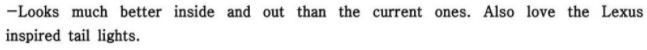 이런 기사를 접한 미국 안의 소비자들에 평가도 우리나라 국내의 평가와 대부분 비슷하다고 보여지고 있습니다. 파격적이면서도 멋진 자동차이며, 무의미한 디자인의 경쟁 모델 디자인보다 낫다는 등 인테리어가 멋있고 차량이 정말 힘을 내고 있는 것 같다와 지금 나와있는 모델보다 내관과 외관이 훨씬 좋아 보인다 등의 긍정적인 반응을 보이고 있습니다.