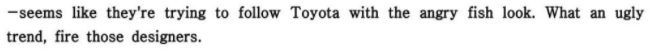 하지만 반대로 혹평에 대해서는 센터콘솔에 버튼이 너무 많으며, 전면부 디자인이 기형적인 바다 생물처럼 보이기도 하며, 화가 난 물고기처럼 보이는 토요타 차량 같기도 하고, 해당 디자인의 가장 좋은 점은 조금 더 멋진 2019년형을 더 싸게 살 수 있다는 것인가 등 국내에 있는 소비자와 비슷한 평가가 이루어 지기도 했습니다.
