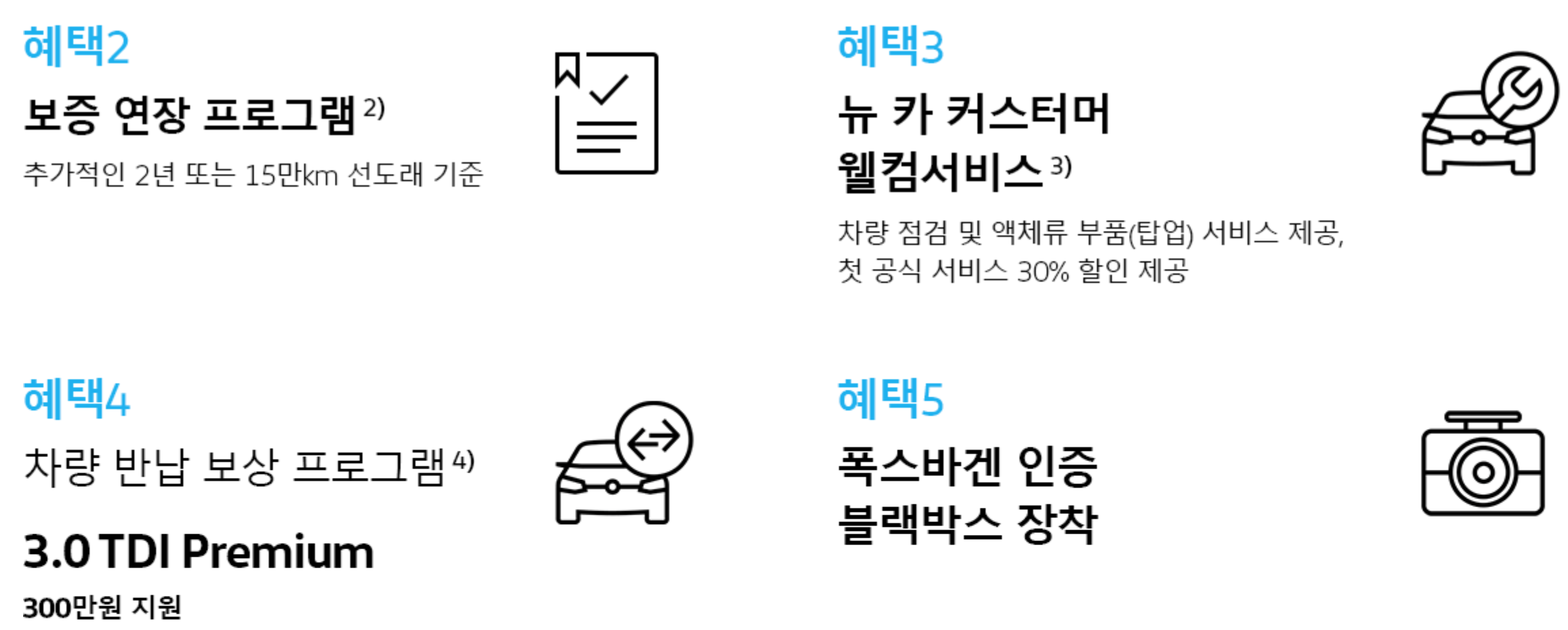 이와같이 어떠한 투아렉 3.0 TDI V6 고객들에게는 파워트레인을 포함해 모든 보증 항목에 대하여 5년 또는 선도래 기준으로 15만km까지 무상보증을 제공하는 '범퍼-to-범퍼 5년 무상보증'이 새롭게 제공된다고하며, 웰컴 서비스 및 키트, 폭스바겐 인증 블랙박스 장착 서비스까지 제공이 된다고 합니다.
