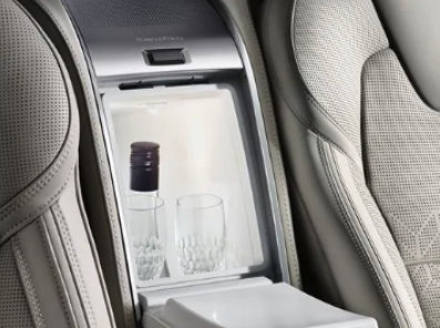 볼보 xc90 실내, 내부에 배치되어진 뒷좌석의 컴파트먼트에는 750ml 크기에 컵 두병 정도가 들어가는 크기로 이미지에서는 Orrefors 크리스탈 글라스 한쌍정도가 수납될 정도의 크기로 보입니다. 이 부분의 바로 위쪽에는 Bowers & Wilkins의 스피커가 추가적으로 적용되어 있습니다.